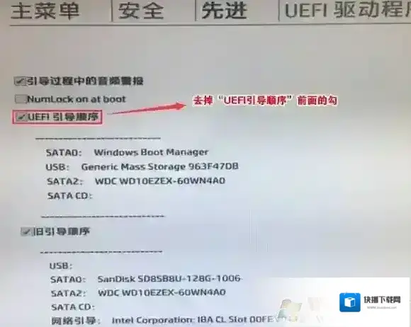 6、进入后将UEFI顺序前面的勾去掉,让机器默认为传统启动,这样方便安装WIN7,如下图所示;