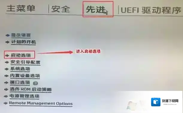 5、F10保存重启后再次开机按ESC,然后选择F10进入BIOS设置,将鼠标移动“先进”选项中,选择”启动选项”后回车进入,如下图所示: