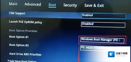 4、继续把boot option#1选项改为普通引导的,boot option#1和boot option#2硬盘启动位置对换,设置第一启动项为普通硬盘引导,带Windwos Boot Manager的为UEFI引导分区,然后按F10保存设置;