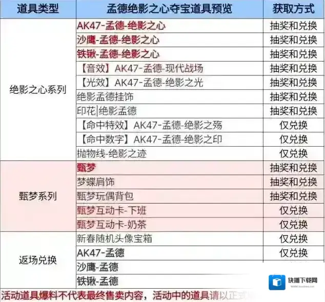不仅如此,AK47-孟德、沙鹰-孟德、铁锹-孟德,以及新春随机头像宝箱也会在兑换区返场。孟德系列武器不仅外观炫酷,还支持双武器形态切换,喜欢孟德套装的CFer可以借此机会入手。