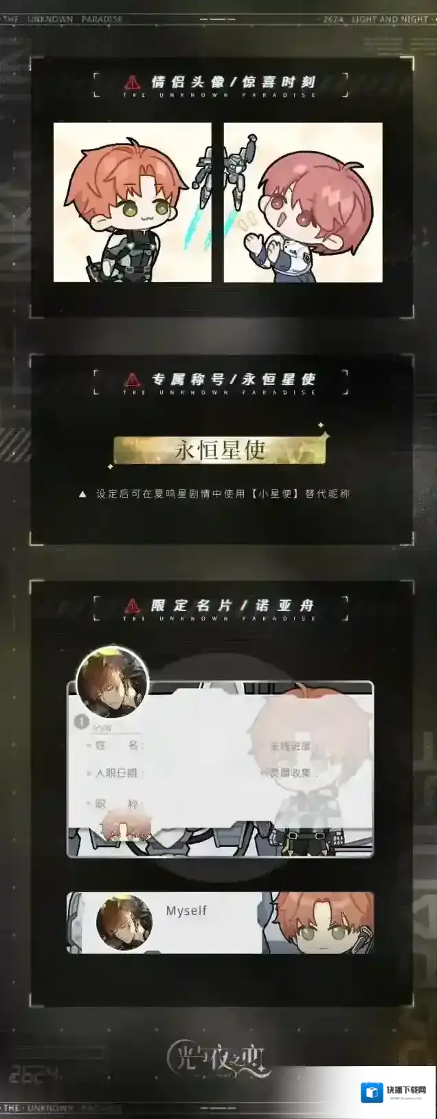 活动期间累计收信210次/240次/270次/320次/350次时,各可在限时计划处领取[名片礼盒],打开后可随机获得以下任一限定名片奖励:[末日纪] [诀别歌] [伊甸园] [命运书] [诺亚舟](不会重复获得)。