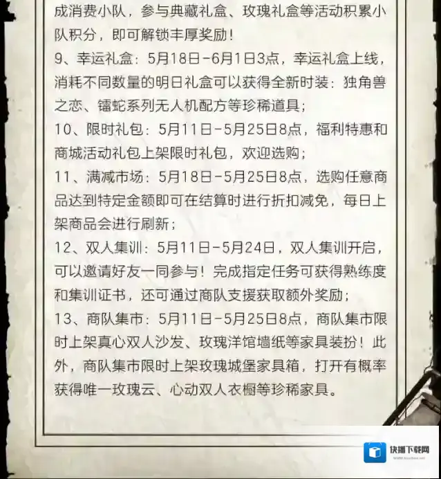 为了充分准备并落实新我们将从5月11日(周四)早上8点00分-8点30分封闭一切活动场所预计持续30分钟如果在此期间未能完成准备工作封闭时间也将相应延长请各位幸存者奔走相告