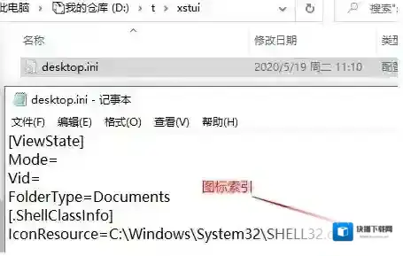 进入刚刚修改图标的目录,将看到 desktop.ini 文件,打开它,图标文件及索引将显示在[.ShellClassInfo]下的IconResource后,逗号后面的即为索引号。