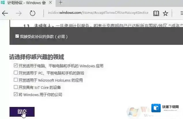 7、我们看到了加入预览体验会员计划后,几个最主要的风险(主要针对移动设备):当软件安装在移动设备上时:(i)它并不打算作为你的主要通讯方式的一种替代方式;(ii)在某些情况下,你可能无法拨打电话(包括拨打紧急服务电话);(iii)它可能无意中损坏你的设备,使其不可操作;并且(iv)你可能遇到增加的数据费用。我们向下滚动,接受协议、提交。