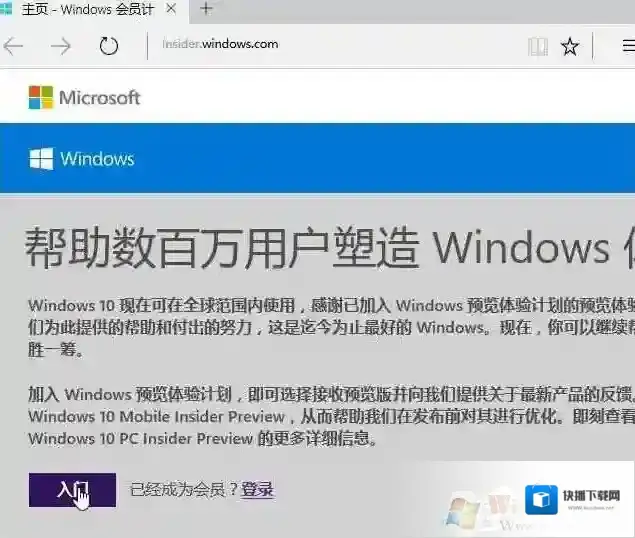 6、浏览器被打开,并转入Windows会员计划主页。我们点击主页中的“入门”超按钮。