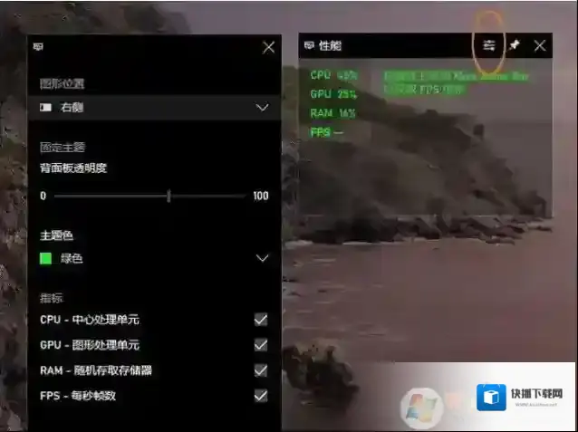 最后,Xbox Game Bar(游戏栏)默认会显示FPS、平均FPS、动态曲线三组参数,同时还有CPU、GPU、RAM等其他监测指标,用户可以通过点击面板右上方的设置按钮,手工调整这些监控项。包括监测指标、主题色、背板透明度等都可以定义