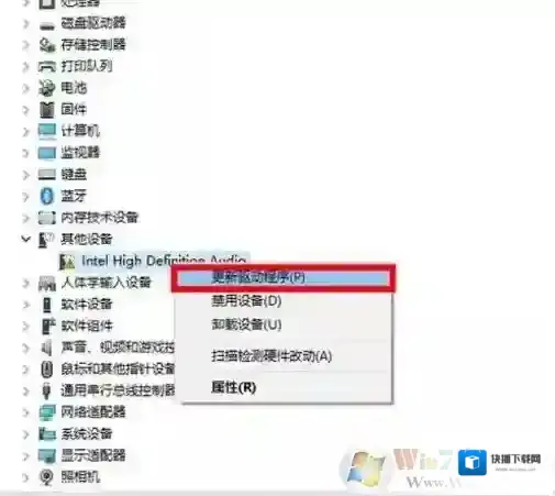 2、在设备管理器中选择声音、视频和游戏控制器,右键点击Realtek High Definition Audio或Intel High Definition Audio —更新驱动程序注:如果要先卸载可能 右键点击卸载设备。