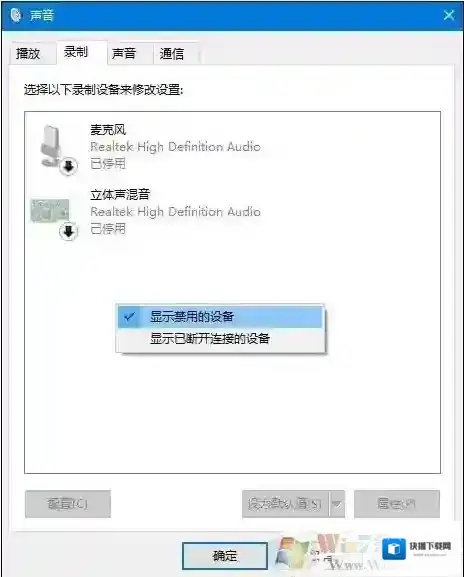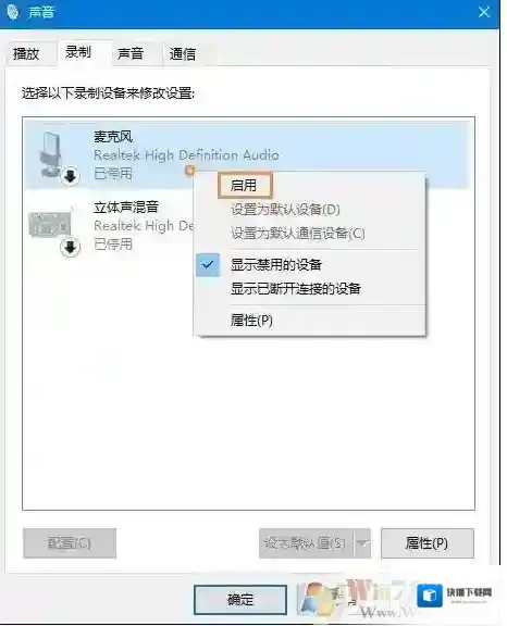 2、显示禁用的设备之后,如果有被停用的麦克风,那么可以右键点击选择启用即可。