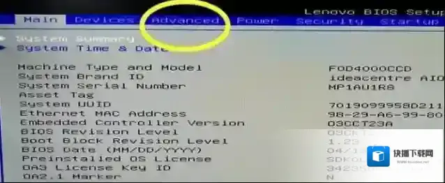 7、重启后进入主板界面选择“advanced”确认后进入。