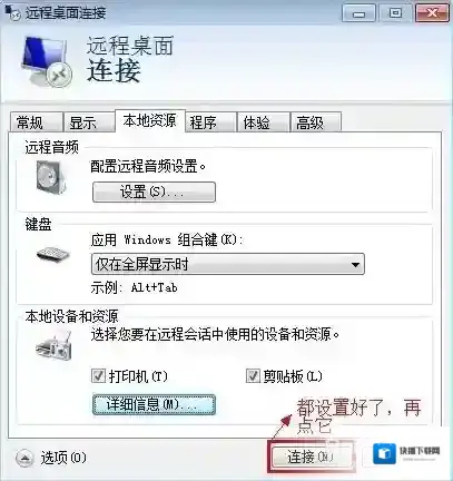 5、在相关设置调整好后,我们就可以点击远程桌面连接窗口下方的连接,如下图