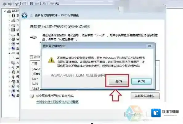 七、最后会弹出一个“不腿甲安装这个设备的驱动程序,因为Window无法验证这个驱动程序是否与硬件兼容…”,这里我们直接点击底部的是,如下图所示。