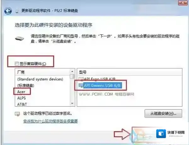 六、下面的这步“选择要为此硬件安装的设备驱动程序”设置非常重要,首先要将显示兼容硬件前面的勾去掉,然后在厂商里,任意选择一个其他笔记本品牌,比如笔者用的是联想笔记本,在这里我们故意选择“宏碁(Acer)”厂商,然后在右侧的型号里,任意选择一个,完成后点击下面的下一步,如下图所示。