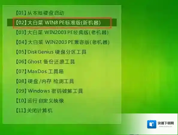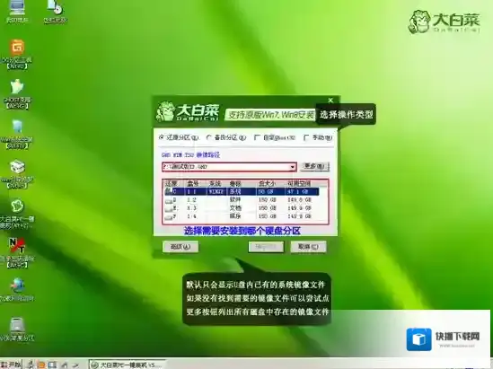 3、进入PE后运行大白菜一键装机工具,然后选择你要安装的系统GHO,再选中你要安装的分区,大多为C盘。