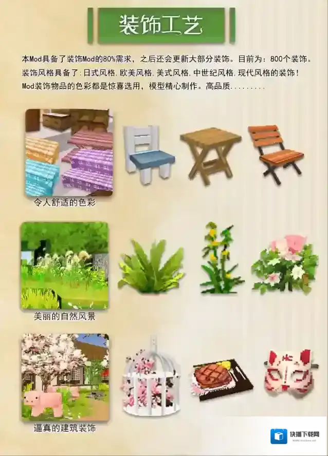 装饰工艺-完整版作者:秋幕晞喜欢搭配装饰的冒险家还不快来看看?这个组件不仅有更多的美丽植物,还有多达800种风格装饰,每个道具更是细节满满!大家可以按照自己的喜好随意搭配,快下载组件用装饰点缀你的小屋吧!