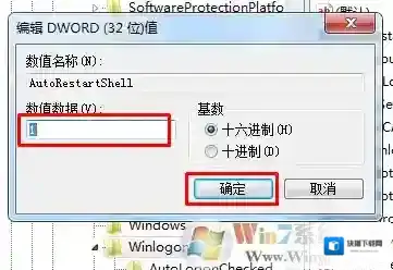 5、将AutoRestartShell数值修改为1;如果没有我们就新建一个AutoRestartShell将数值设定为1即可