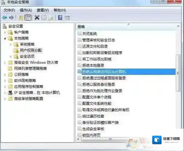 3、在本地策略–用户权限分配中找到:拒绝从网络访问这台计算机,然后双击,删除Guest,确定