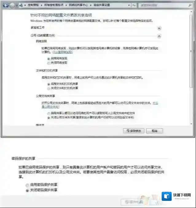 3、启用网络发现、启用打印机和文件共享、禁用密码保护!