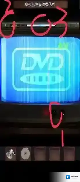 打开电视的时候要记得先调到DVD频道(图中数字1)再打开DVD机(数字2)再放碟片(数字3)然后用扩音器录下来就行。第二章完结。