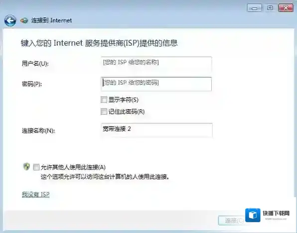 第六步:我们只要在出现在对话框中根据提示输入用户名、密码以及宽带的快捷图标的名称。然后点击连接,这样宽带连接设置就完成了。