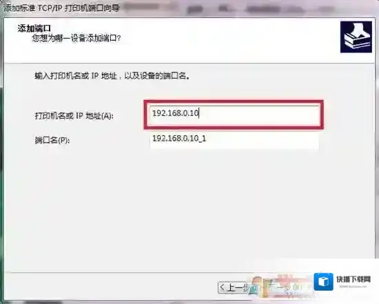 5.输入您打印服务器的IP地址,点击下一步。