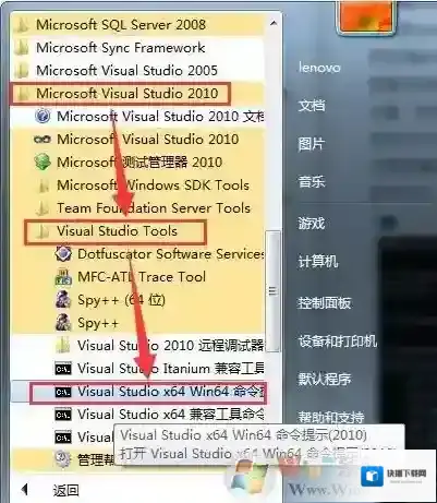 7、打开所有程序,找到在Visual Studio Tools文件夹下的Visual Studio x64 Win64命令提示(2010)工具,如图: