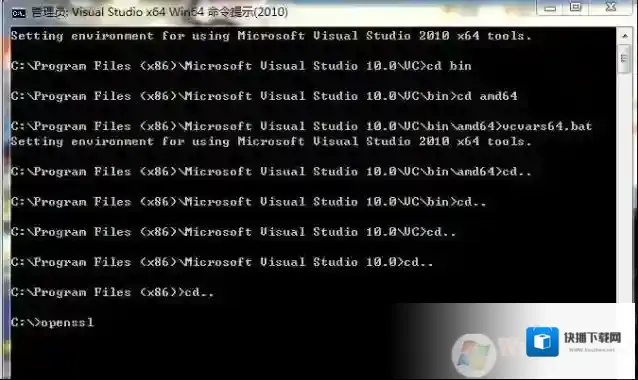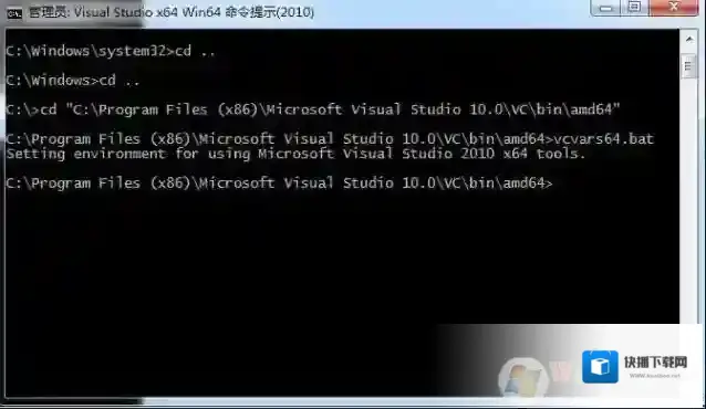 执行命令:cd C:Program Files (x86)Microsoft Visual Studio 10.0VCbinamd64执行命令:vcvars64.bat