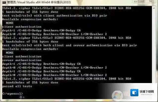 12、 输入命令:msdo_win64a13、将命令提示符定位到C:Program Files (x86)Microsoft Visual Studio 10.0VCbinamd64 (VS2010安装位置), 然后输入 vcvars64.bat,会显示Setting environment for using Microsoft Visual Studio 2010 x64 tools. (必须要进行操作)14、再次将命令提示符定位到openssl源码目录下 cd C:openssl输入命令:nmake -f msnt.mak ; 执行完后会在openssl-1.0.1g目录下生成out32和tmp32两个文件夹,out32文件夹中会生成两个静态库和一些执行文件,tmp32文件夹中会生成相应的汇编文件。15、然后 输入命令: nmake -f msnt.mak test 检查上一步编译是否成功,如果成功则最后显示“passed all tests”字样,如图: