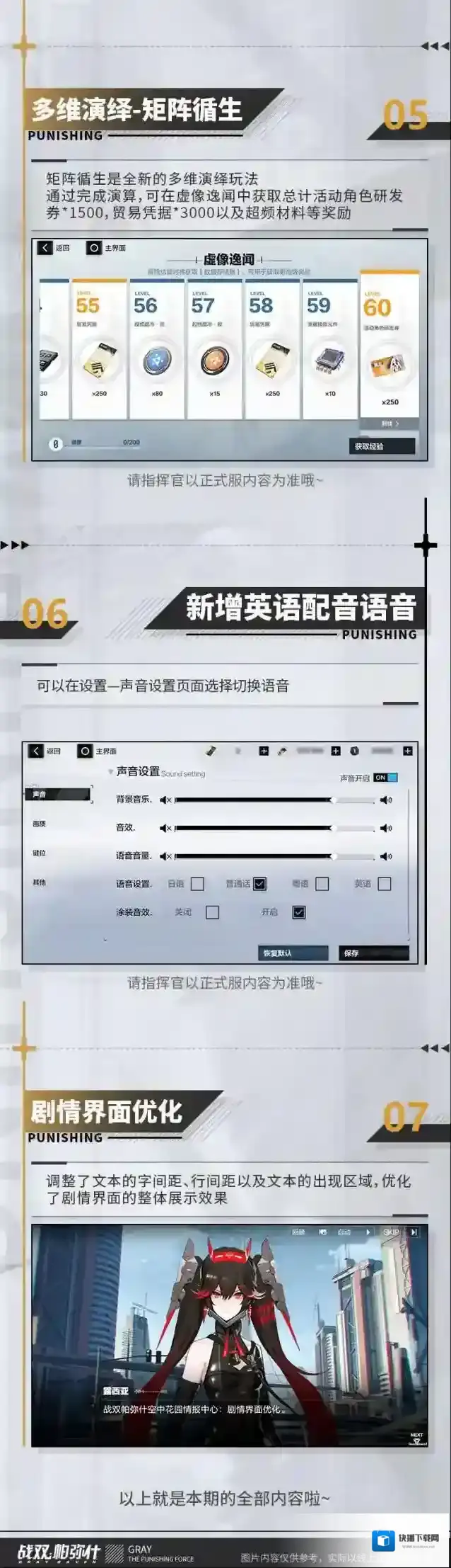 为指挥官带来新版本测试服内容~新增夏日幸运星活动,新增限定基准成员狙击检定100%UP,幻痛囚笼终极区BOSS更新,成员 装备页面更新,全新多维演绎玩法-矩阵循生,新增英语配音语音,优化剧情界面等内容具体详情请指挥官查看下方长图↓↓↓
