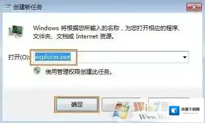 5、创建新任务:这时会弹出创建新任务窗口,在输入框中,输入explorer.exe,然后点击确定按钮,如下图所示: