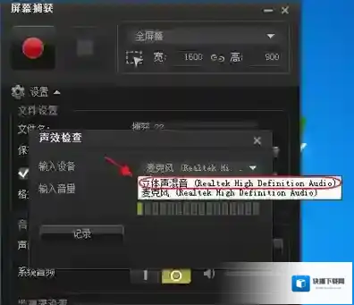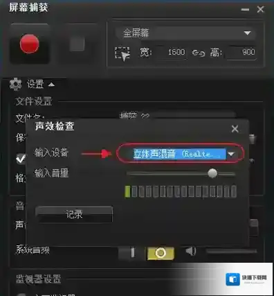 设置软件4、点击“设置”后,会出现下拉界面,在该界面中会详细列出屏幕捕获各个功能设置,主要包括“文件设置”、“音频设置”和“监视器设置”三个部分,在“音频设置”模块有个“声效检查”,点击它,打开“声效检查”选项;