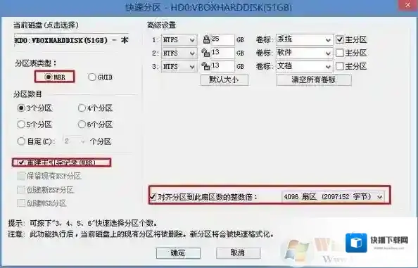 重新分区:磁盘格式转换完成后,点击快速分区,勾选 分区表类型为 MbR ,勾选了重建主引导记录MBR,选择需要分区的个数以及大小,当然大家可以点击“自定”来设置合适的分区,按下确定后开始分区(如果是固态硬盘或者是东芝的硬盘要进行4K对齐一下),如下图:
