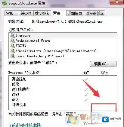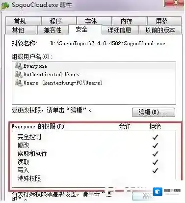 7、修改成功以后,会发现SogouCloud.exe程序图标左下角多了个黄点,SogouCloud.exe属性中everyone的权限已经全部改为拒绝了,完成以上操作后云计算就再也不会自动启动了。