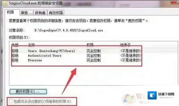 6、选择更改权限,在更改权限选项卡中把“包括可从该对象的父项继承的权限”前的勾勾掉,然后把所有权限项目都从允许改为拒绝,有些给不了的,选择清除清除掉;