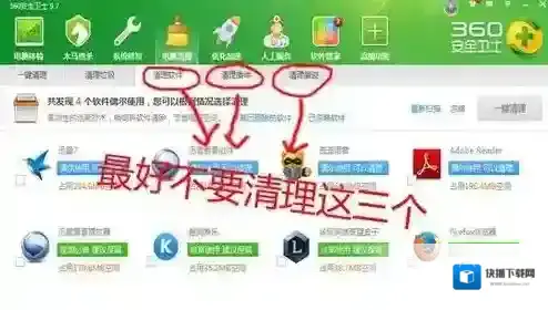 不周六、还有下图中画红圈的三个”清理软件“、”清理插件“、”清理痕迹“。这三个最好不要清理。因为很多软件、插件都是要用到的,上网痕迹也不要清理,因为你以前保存的某个网站的用户名和密码都会被删除。