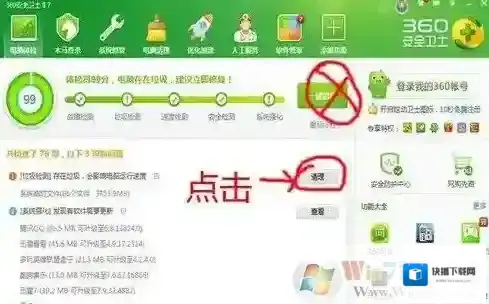 步骤二、体检结束会出现下图,这时千万别着急点“一键修复”,因为一键修复包括很多,不仅仅是垃圾,还有软件更新等等,总之你别用“一键修复”。你应该点击的是下图中画红圈的“清理”按钮。这才是清理垃圾。