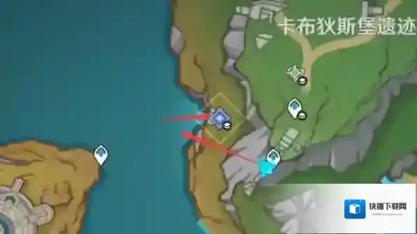 1、第一步我们需要打开地图千万卡布狄斯堡遗迹位置处,与如图所示的左侧的蓝色位置互动。
