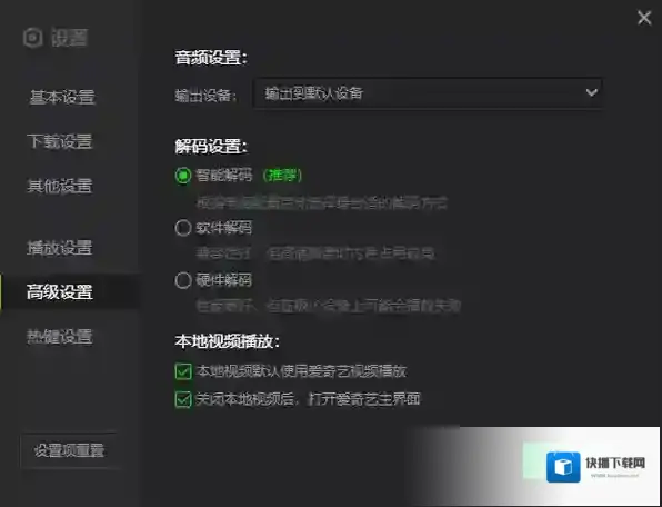 调节设置音频的输出设备,选择视频的解码方式,以便于在视频观看更流畅更清晰。在本地视频播放上,如果不想默认使用爱奇艺播放,可以取消勾选对应项。