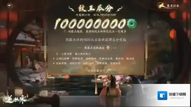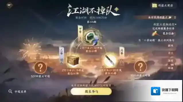 1月29日起一号福星带来赐福奇遇概率提升,庄园作物产量提升,镜天阁 洞庭问剑 谪仙惊涛副本外观掉率加成。2月4日起二号福星带来江湖风雨事,舞阳城,剑梦临渊等副本外观掉率加成。所有福星加成持续到2月25日结束。不管哪个活动,都门槛超低,稍微动动手指,奖励拿满!江湖不掉队 瓜分1亿非绑定纹玉!新玩家、回流玩家,玩游戏不仅不会掉队,还有福利拿!新老玩家组队参与游戏内各种玩法,即可获得雨***(新老玩家均可获得),雨***可以用于江湖不掉队活动抽奖,有机会获得天赏石、自选稀有内功、绑定鉴石神凿大奖!最后还将瓜分1亿非绑定纹玉!