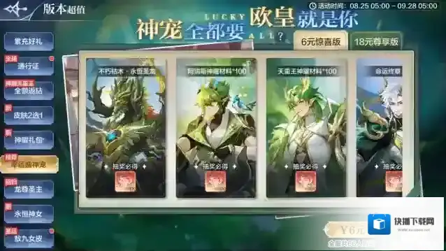 活动内容:奖池更新!生命王者·阿瑞斯专属神曜材料*100、精灵不朽枯木·永恒圣龙、战神·天蛮王专属神曜材料*100、精灵命运终章·梵瑞、精灵万物恩泽·界皇加入,欧皇的天选时刻等你来见证~