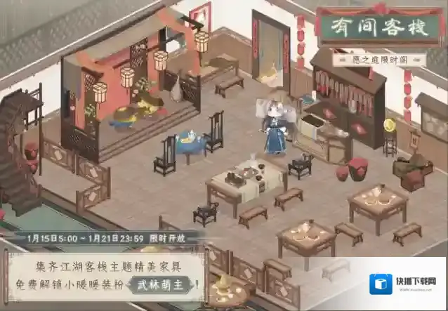 1月15日5:00-1月21日23:59,在小屋愿之庭的限时抽奖阁“有间客栈”许愿,可获得江湖客栈主题家具!集齐所有限定家具还可领取全新小暖暖装扮“武林萌主”!