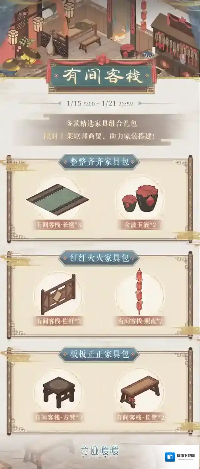 活动期间,联邦商贸将推出多款超值礼包,内含有间客栈限定家具组合,助力客栈家装搭建!礼包详情如下: