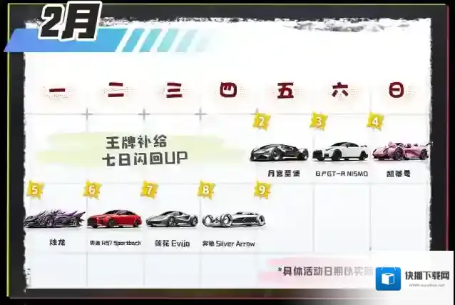 此外,王牌补给开放时间恰逢龙年除夕倒计时一周,为了让每位车手都能开上爱车一块过年,王牌补给-七日闪回活动也将同步开启–2月2日-2月8日,连续7天,每天都会有一台王牌神车开启限时概率up,“提车日程表”西理都帮各位准备好了,保存转发给好车友,过过提车瘾!