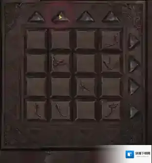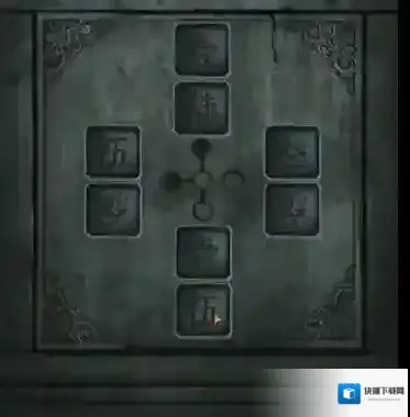 2、门旁边有一个机关,移动方块到正确的位置上发光,机关解开方式如下图,获得一个轮状零件。