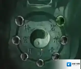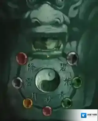 12、切换女性视角,机巧阁龙头上面宝石颜色如下图,得到玉印,千书阁桌上有印泥,获得印泥玉印,屍解居门联缺少了一个字,把它盖在屍解居右边的门联上,获得猴子雕像。