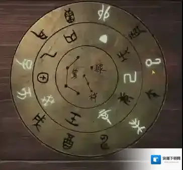 4、点击左边的门来到机巧阁,把轮状零件放在凹槽上面,齿轮转动中间有字是正门上面的线索,女生切换视角男生,把字填到男生视角门上面,密码如下图,打开门。