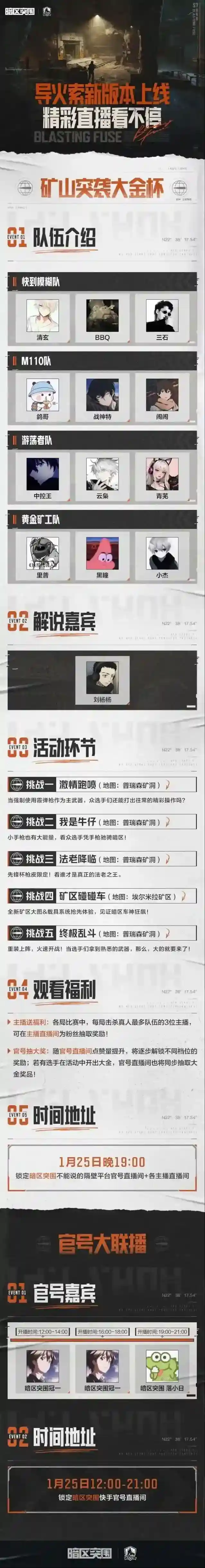 先锋杯六强集结,职业战队大战主播战队,百万奖金将花落谁家?!全明星表演赛火热开打,24名暗区顶流选手,驾驶载具在全新地图肆意狂飙,究竟谁才是真正的“暗区飙车王”?!7大男团集体登场,多位首领共同演绎带你通往卡莫纳,更有交响乐团倾情演奏,为各位先锋带来暗区经典曲目!同时,卡莫纳之夜春节许愿池直播火热开抽,“壕送”5亿柯恩币,哪位先锋才是真正的暗区锦鲤?!赶紧锁定虎牙直播、斗鱼、快手游戏、腾讯视频、视频号、微博以及bilibili,第一时间收看卡莫纳之夜的精彩内容吧~矿山突袭大金杯25日19:00火热开打新版本上线,大金杯先来试试水!看快到模糊队、M110队、游荡者队、黄金矿工队四队在矿山开启大混战,官方特邀刘杨杨解说精彩的五轮挑战,让我们看看都会发生什么样的精彩瞬间吧!