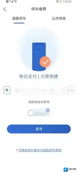 4、接着进入,选择道路停车或公共场库,选择需要缴费的车牌号,点击查询即可进入缴费页面缴费。