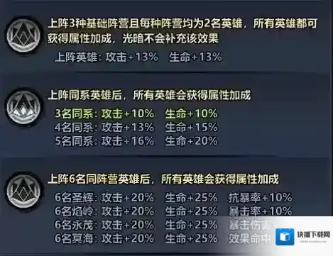 当我方英雄阵营克制目标时,将会提高暴击、触发强击以及提升伤害,反之,若被克制时,将会减少暴击、触发弱击以及降低伤害。