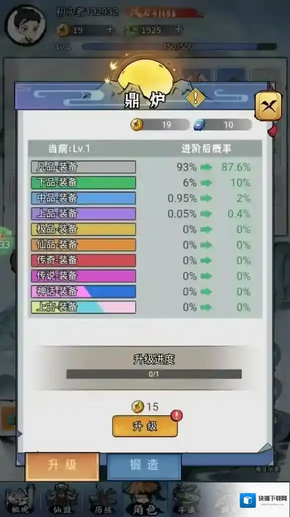 4、点击炉子下方等级,可以将鼎炉升级,提高稀有装备爆率。