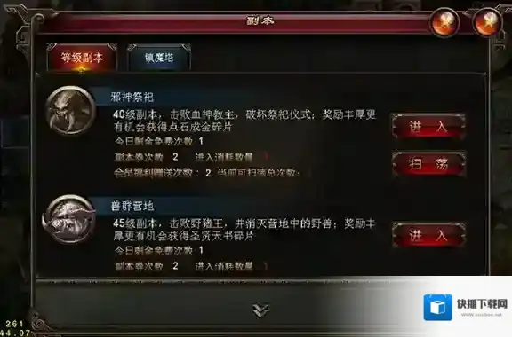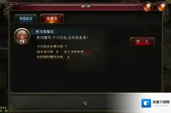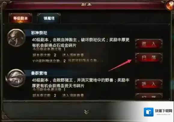 ⑤镇魔塔:前期后期主要获得经验方法之一。于副本一样,每日一次免费机会,购买副本卷轴课额外增加2次机会。开通青铜VIP可额外增加1次机会。开通黄金VIP额外赠送2次机会。